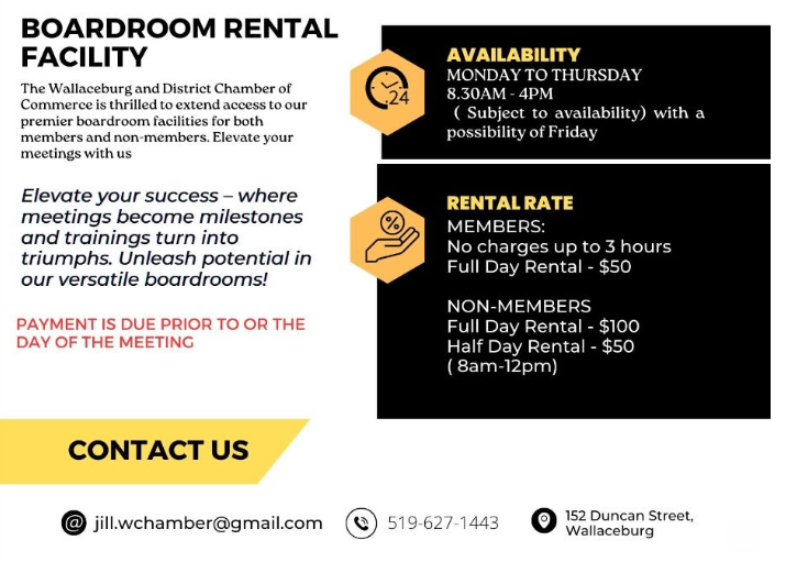 Business January 16, 2025 Wallaceburg & District Chamber of Commerce We are thrilled to extend access to our premiere board room for both members and non members. Elevate your meetings with us. Previous articleCK Public Health issues notices for students with incomplete immunization recordsNext articlePatterson Motors 51 McNaughton Ave, Wallaceburg - Advertisment -