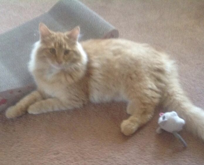 Missing from Mooney St. area. Large Male neutered cat (picture is not recent, he’s twice the size). If seen please message Sarah Here.