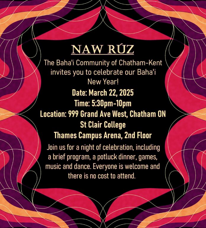 The Bahá’ís of Chatham-Kent are inviting the community to celebrate the Bahá’í New Year with an evening of cultural unity, food and entertainment.