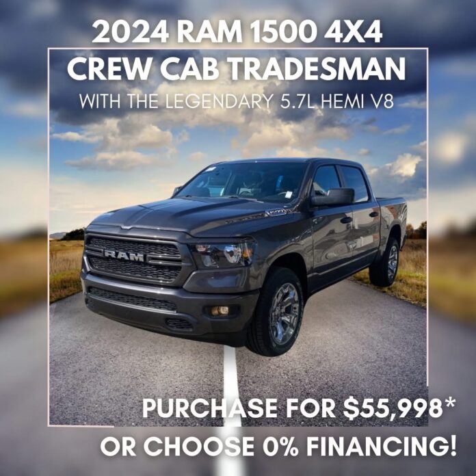 Drive home the legendary power of the 2024 Ram 1500 DT Tradesman Crew Cab 4×4 with the 5.7L HEMI® V8 — while you still can!