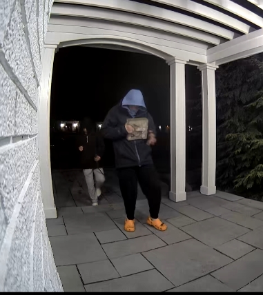 Male #2 – Appears to be significantly smaller than Male #1. He is wearing a black coat with a black hood pulled over his head. He has grey sweat pants and is wearing distinctive white Crocs.