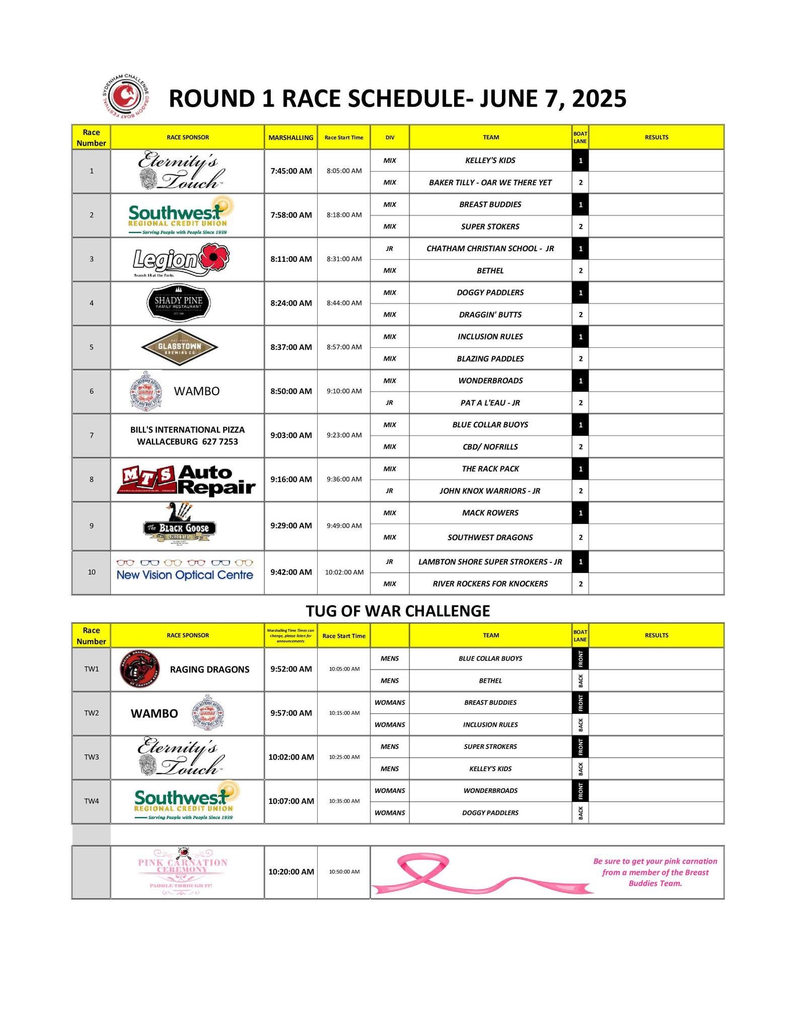 Stay sharp and listen for announcements! If races are ahead of schedule, your team might be called to the marshalling area earlier than expected. The first team will be marshalled and loaded into the boats at 7:45 AM—so be ready!