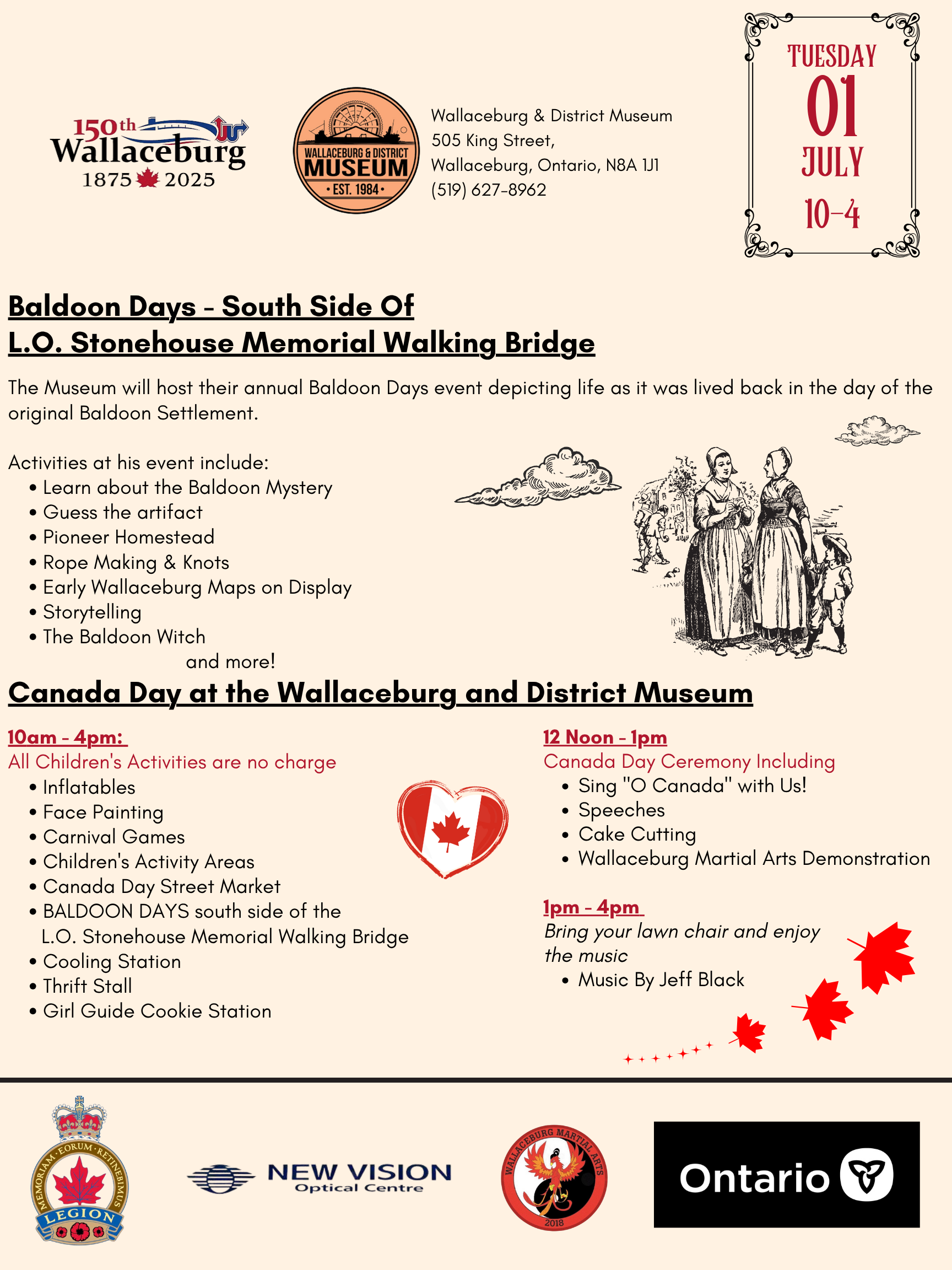 Wallaceburg will mark Canada Day on Tuesday, July 1, with a full slate of activities, including Baldoon Days on the south side of the L.O. Stonehouse Memorial Walking Bridge.