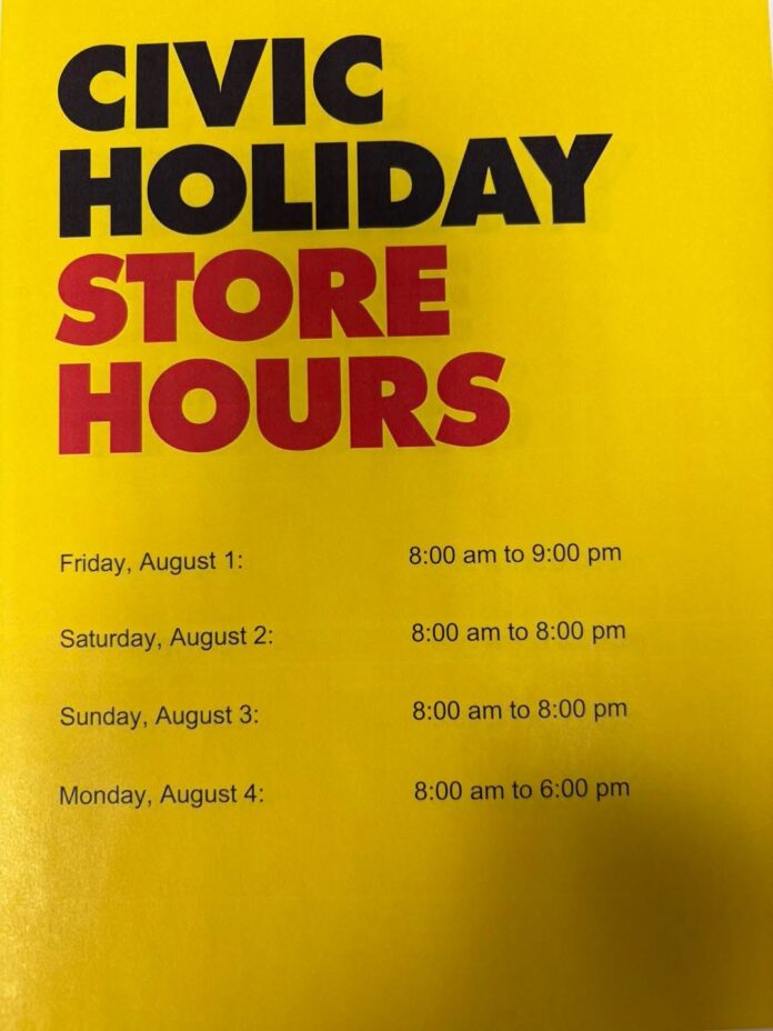 We will be open Civic Holiday 8 to 6 for your shopping convenience.