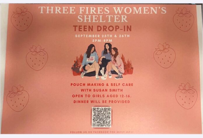 A teen drop-in will be held Sept. 25 and 26 from 5 to 8 p.m. at the Three Fires Women’s Shelter on Walpole Island.