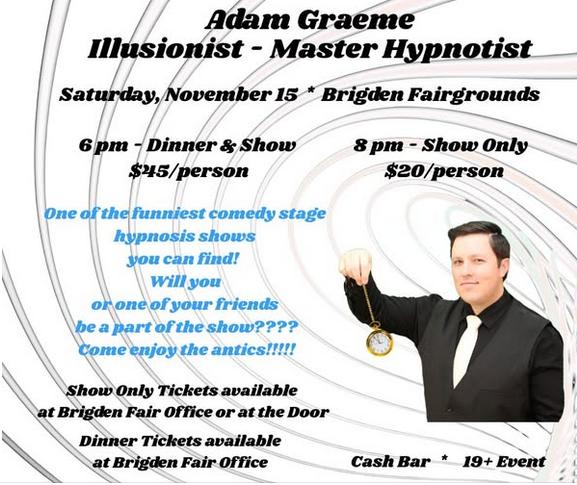 A night of laughs and surprises is set for Saturday, November 15, when illusionist and master hypnotist Adam Graeme takes the stage at the Brigden Fairgrounds.