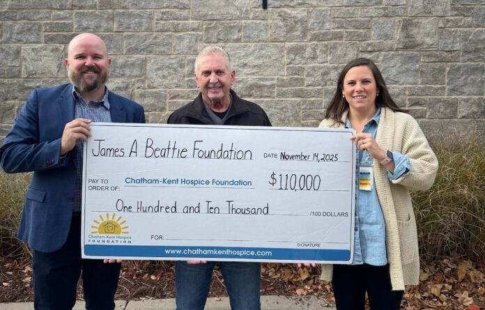 The Chatham-Kent Hospice Foundation has received a $110,000 donation from the James A. Beattie Foundation, a contribution made in memory of long-time foundation president Jack Morrison, who died Oct. 26, 2025.