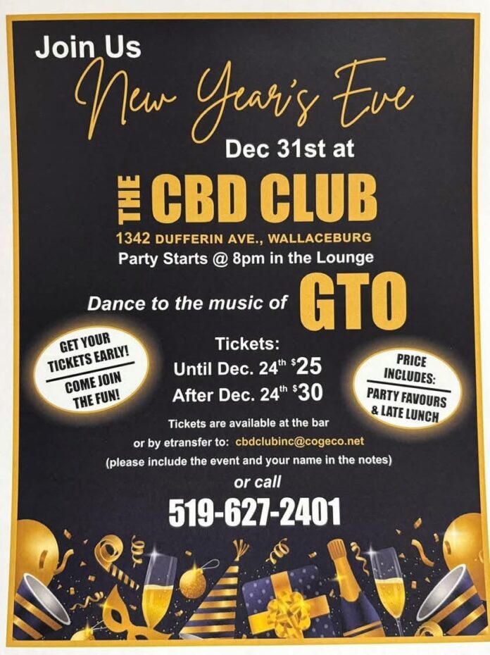 Business December 28, 2025 New Year’s Eve at the CBD club Do you have plans to bring in 2026? We would love for you to join us. 1342 Dufferin Ave. Wallaceburg. Previous articleMark And Sarah‘s No Frills WallaceburgNext articleCloudy, windy, chance of rain and flurries, snow squall risk, high -3°C, wind chill -13°C - Advertisment -