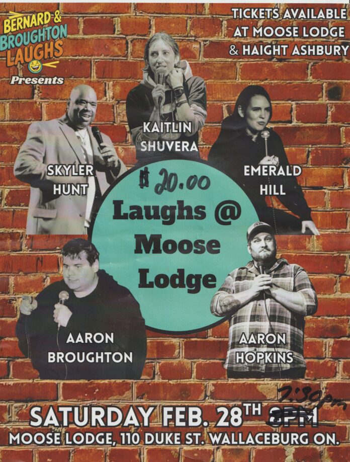 Get ready for a night of big laughs at the Moose Lodge. Bernard & Broughton Laughs is bringing an incredible lineup of comedians to Wallaceburg, featuring Skyler Hunt, Kaitlin Shuvera, Emerald Hill, Aaron Broughton, and Aaron Hopkins.