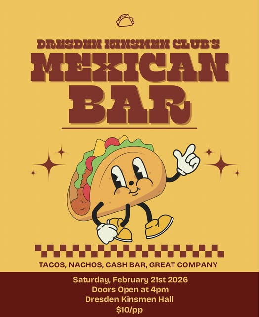 The Dresden Kinsman Hall is inviting the community to a Mexican Pub Night on Saturday, Feb. 21, following the chilli run at the Dresden Legion.
