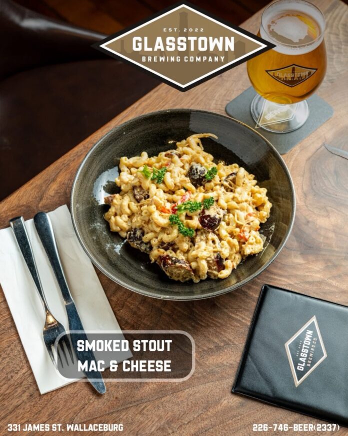 Smoked Stout Mac & Cheese — loaded with stout-braised bratwurst, roasted red peppers, caramelized onions, sauerkraut, and elbow noodles, all tossed in a smoky Gouda & cheddar cheese sauce infused with our stout.