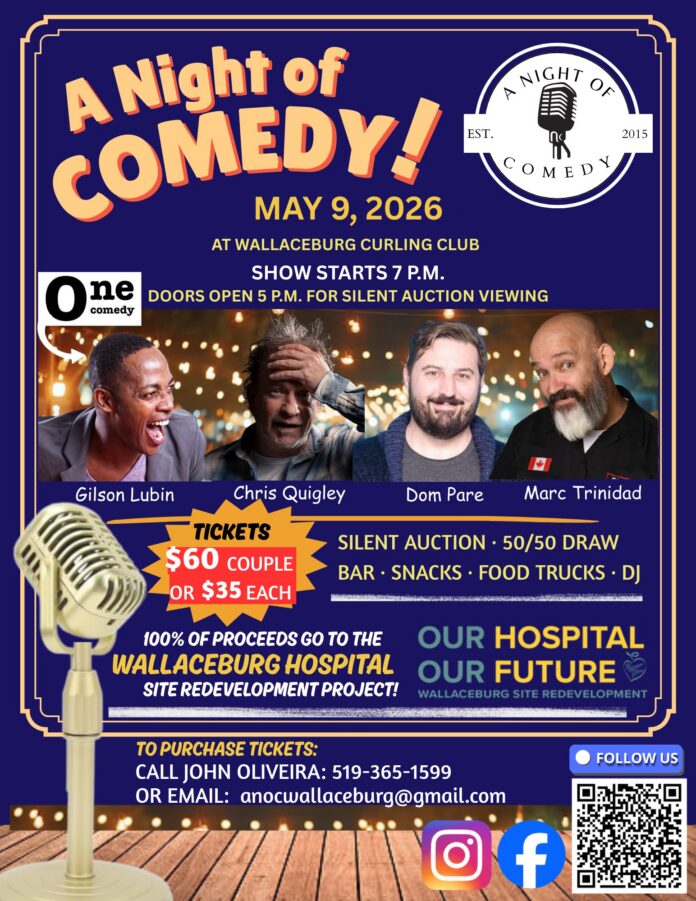 The event, hosted by A Night of Comedy Wallaceburg at the Sydenham Community Curling Club, is scheduled for May 9, 2026, and will raise funds for the Our Hospital Our Future Wallaceburg redevelopment project.